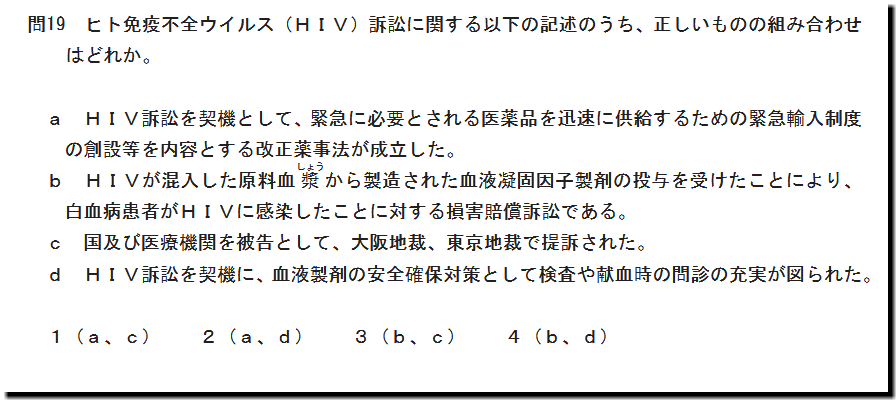選択肢bの「HIVが混入した原料血漿 から製造された血液凝固因子製剤の投与を受けたことにより、 白血病患者がHIVに感染したことに対する損害賠償訴訟である。」ですが、誤った記述です。