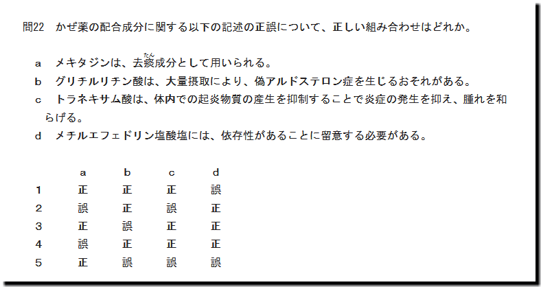 令和7年度(2025年度)福島県 登録販売者試験の過去問と解説。本問は、「医薬品」の「かぜ薬の配合成分」の出題です。基礎・基本的なものばかりなので、難しいところはありません。テキストと過去問を繰り返しておけば、まず、取れます。