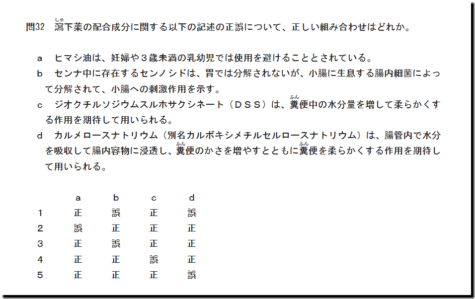 令和7年度(2025年度)福島県 登録販売者試験の過去問と解説。本問は、「医薬品」の「瀉下薬」についての問題です。基礎・基本的なものばかりなので、難しいところはありません。テキストと過去問を繰り返しておけば、まず、取れます。