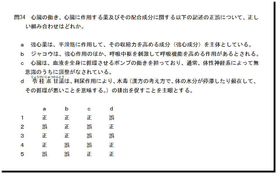選択肢dの「苓桂朮甘湯 は、利尿作用により、水毒(漢方の考え方で、体の水分が停滞したり偏在して、 その循環が悪いことを意味する。)の排出を促すことを主眼とする。」ですが、正しい記述です。