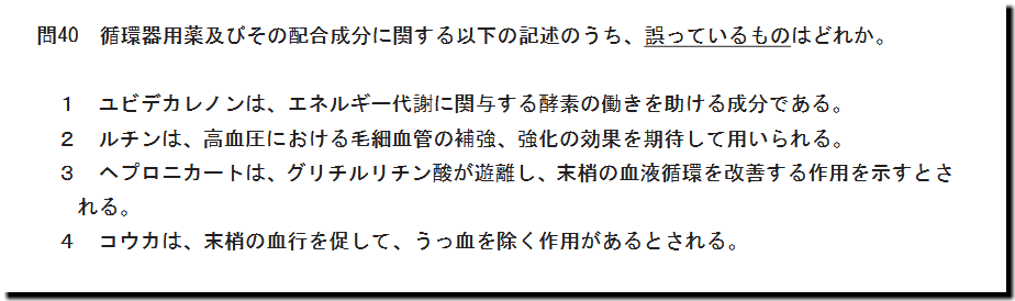 令和7年度(2025年度)福島県 登録販売者試験の過去問と解説。本問は、「医薬品」の「循環器用薬」についての問題です。生薬の選択肢が1つありますが、問題ないです。基礎・基本的なものばかりなので、難しいところはありません。テキストと過去問を繰り返しておけば、まず、取れます。