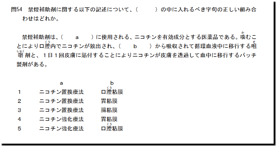 令和7年度(2025年度)福島県 登録販売者試験の過去問と解説。本問は、「医薬品」の「禁煙補助剤」についての問題です。基礎・基本的なものばかりなので、難しいところはありません。テキストと過去問を繰り返しておけば、まず、取れます。