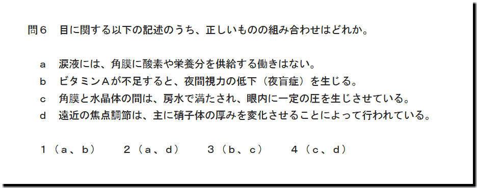 令和7年度(2025年度)福島県 登録販売者試験の過去問と解説。本問は、「人体」の「目」についての問題です。基礎・基本的なものばかりなので、難しいところはありません。テキストと過去問を繰り返しておけば、まず、取れます。