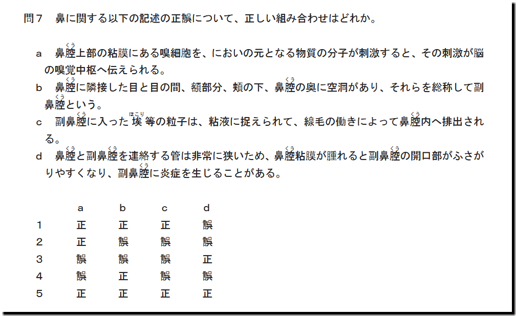 令和7年度(2025年度)福島県 登録販売者試験の過去問と解説。本問は、「人体」の「鼻」についての問題です。基礎・基本的なものばかりなので、難しいところはありません。テキストと過去問を繰り返しておけば、まず、取れます。