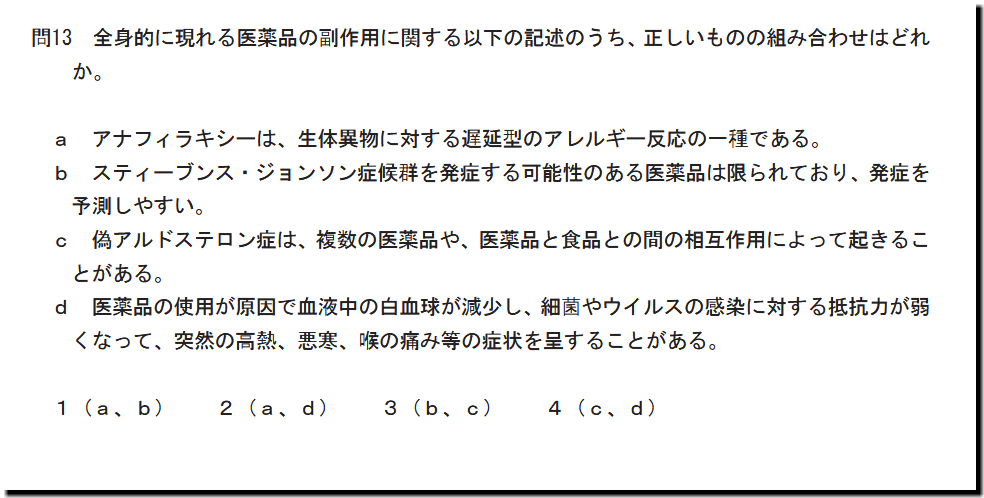 令和7年度(2025年度)福島県 登録販売者試験の過去問と解説。本問は、「人体」の「全身的に現れる医薬品の副作用」についての問題です。基礎・基本的なものばかりなので、難しいところはありません。テキストと過去問を繰り返しておけば、まず、取れます。