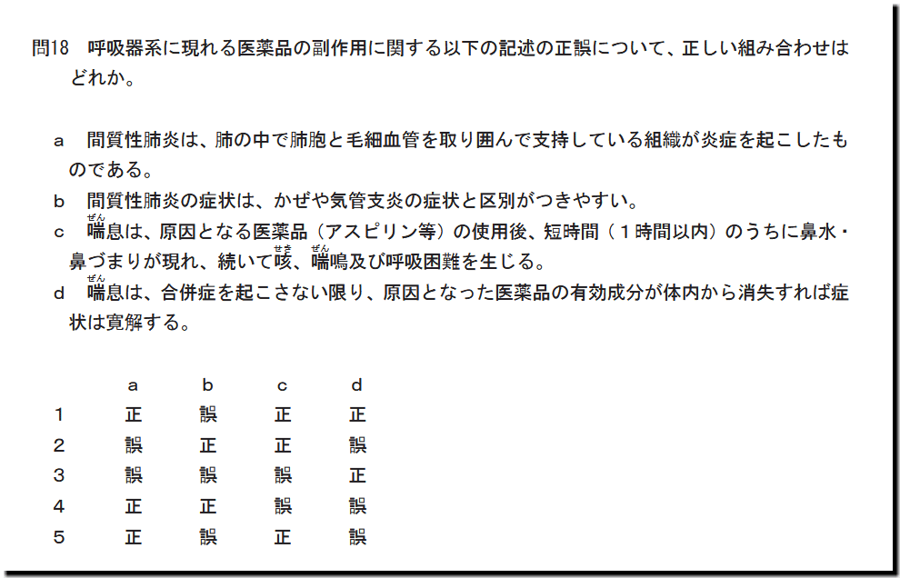 令和7年度(2025年度)福島県 登録販売者試験の過去問と解説。本問は、「人体」の「呼吸器系の副作用」についての問題です。基礎・基本的なものばかりなので、難しいところはありません。テキストと過去問を繰り返しておけば、まず、取れます。