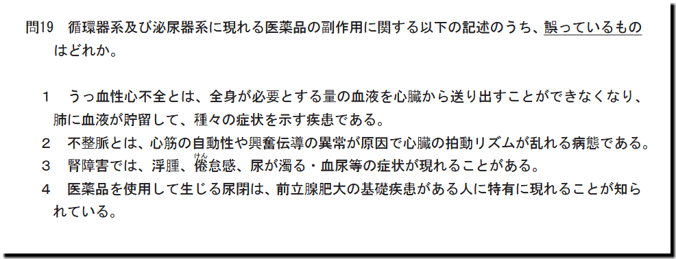 令和7年度(2025年度)福島県 登録販売者試験の過去問と解説。本問は、「人体」の「循環器系及び泌尿器系の副作用」についての問題です。基礎・基本的なものばかりなので、難しいところはありません。テキストと過去問を繰り返しておけば、まず、取れます。