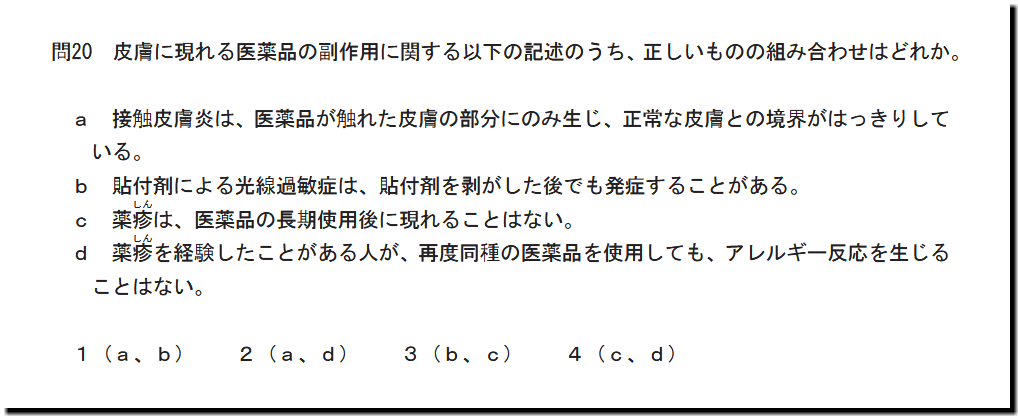 令和7年度(2025年度)福島県 登録販売者試験の過去問と解説。本問は、「人体」の「皮膚に現れる副作用」の問題です。基礎・基本的なものばかりなので、難しいところはありません。テキストと過去問を繰り返しておけば、まず、取れます。
