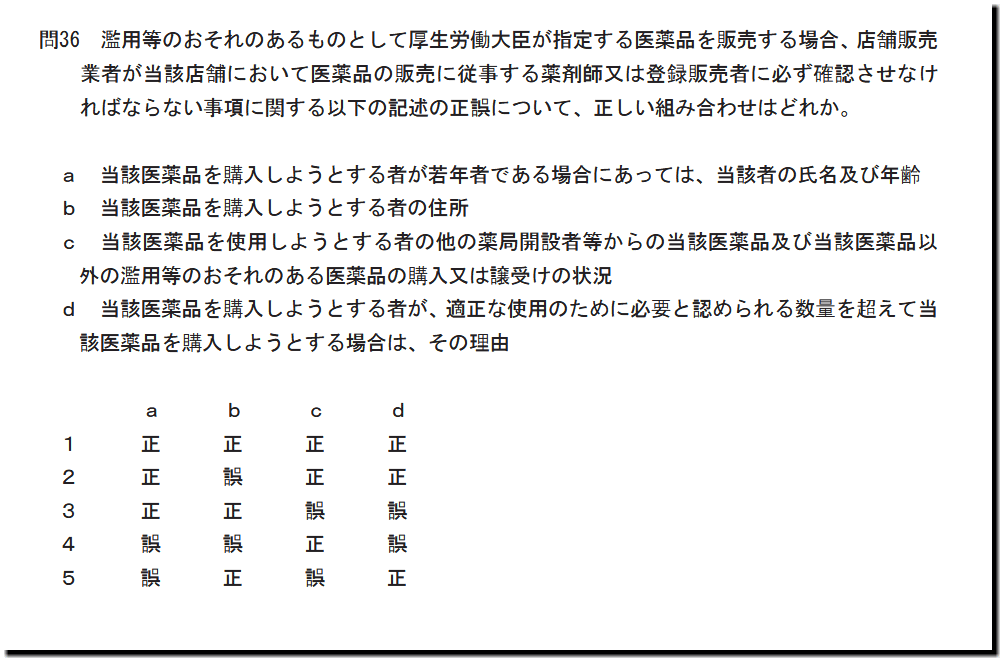 令和7年度(2025年度)福島県 登録販売者試験の過去問と解説。本問は、「法規」の「濫用等のおそれのある医薬品」についての問題です。基礎・基本的なものばかりなので、難しいところはありません。テキストと過去問を繰り返しておけば、まず、取れます。