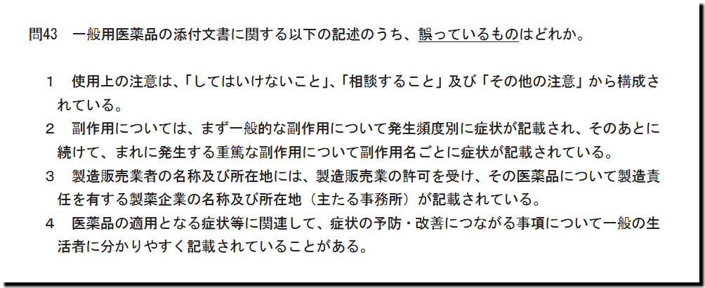 選択肢2の「副作用については、まず一般的な副作用について発生頻度別に症状が記載され、そのあとに 続けて、まれに発生する重篤な副作用について副作用名ごとに症状が記載されている。」ですが、誤った記述です。