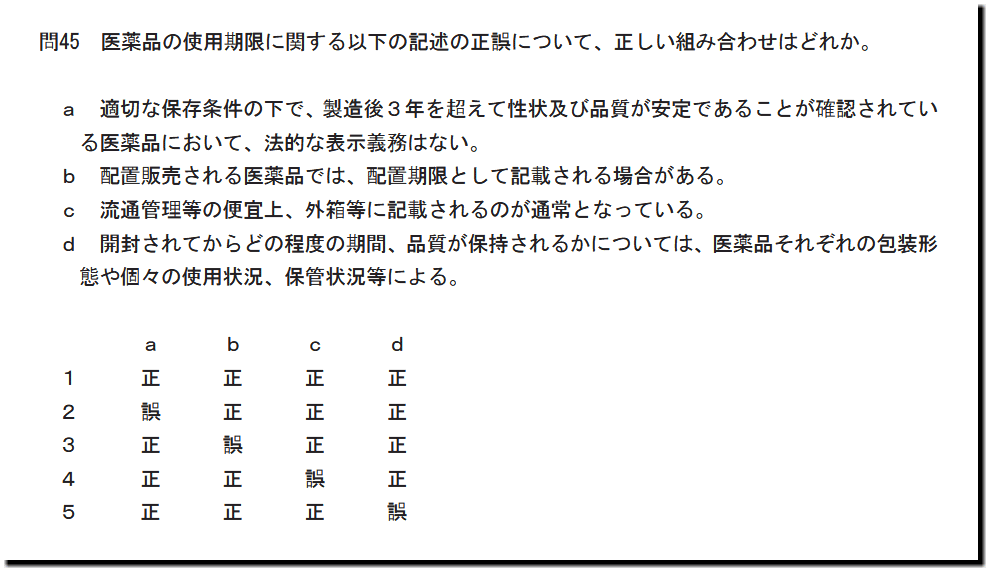 令和7年度(2025年度)福島県 登録販売者試験の過去問と解説。本問は、「適正使用」の「医薬品の使用期限」についての問題です。基礎・基本的なものばかりなので、難しいところはありません。テキストと過去問を繰り返しておけば、まず、取れます。