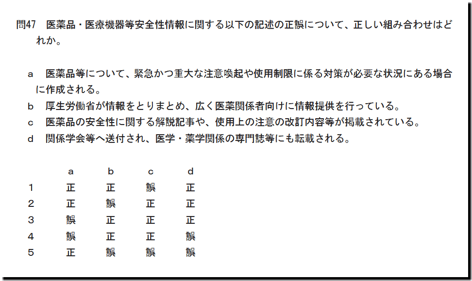 令和7年度(2025年度)福島県 登録販売者試験の過去問と解説。本問は、「適正使用」の「医薬品・医療機器等安全性情報」についての問題です。難しいところはありません。テキストや過去問で、基礎・基本事項を押えて臨んでください。