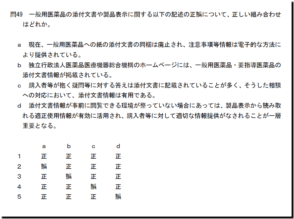 選択肢cの「購入者等が抱く疑問等に対する答えは添付文書に記載されていることが多く、そうした相談 への対応において、添付文書情報は有用である」ですが、正しい記述です。
