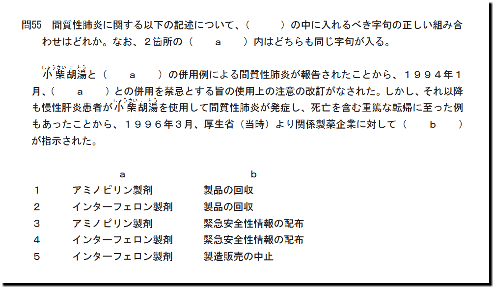 令和7年度(2025年度)福島県 登録販売者試験の過去問と解説。本問は、「適正使用」の「間質性肺炎」についての問題です。基礎・基本的なものばかりなので、難しいところはありません。テキストと過去問を繰り返しておけば、まず、取れます。