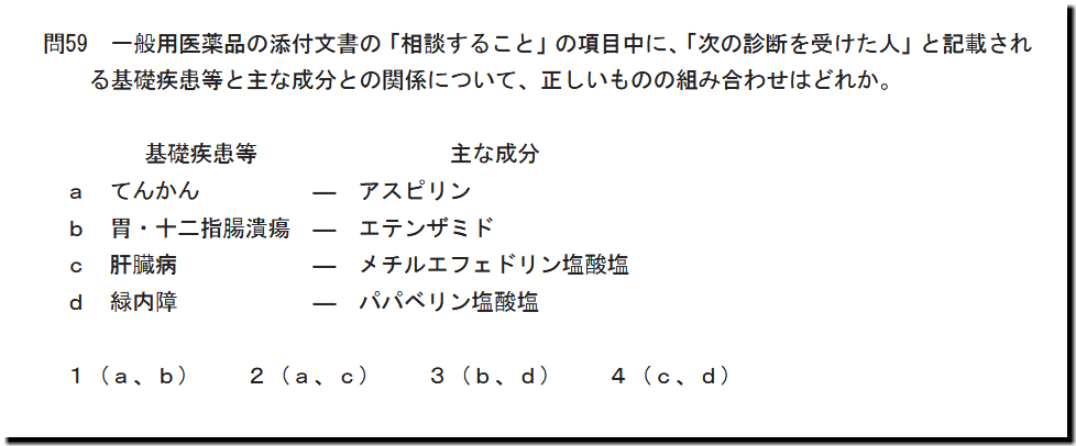 令和7年度(2025年度)福島県 登録販売者試験の過去問と解説。本問は、「適正使用」の「相談すること‐基礎疾患」についての問題です。。「相談すること」は、費用対効果が悪いです。できなくても仕方ないですが、解けるようにはなっておきましょう。