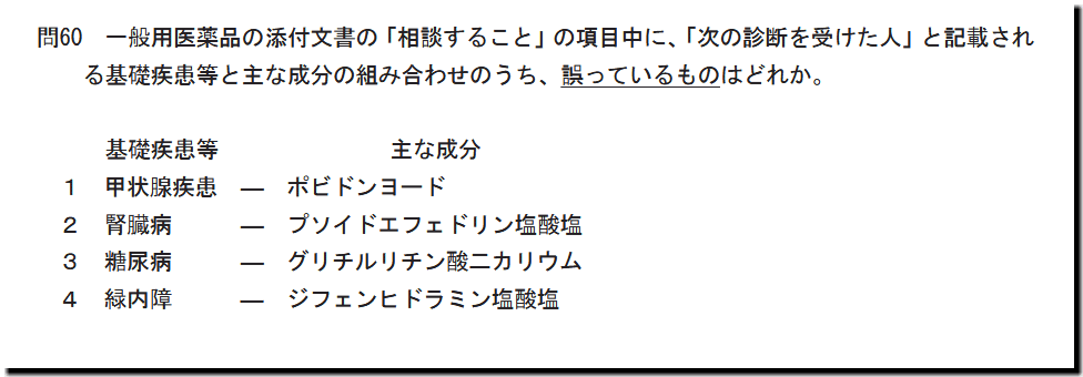 令和7年度(2025年度)福島県 登録販売者試験の過去問と解説。本問は、「適正使用」の「相談すること‐次の診断を受けた人」についての問題です。「相談すること」は、費用対効果がよくないです。過去問に出たことは、甘く見てはいけないので、解けるようにはなっておきましょう。