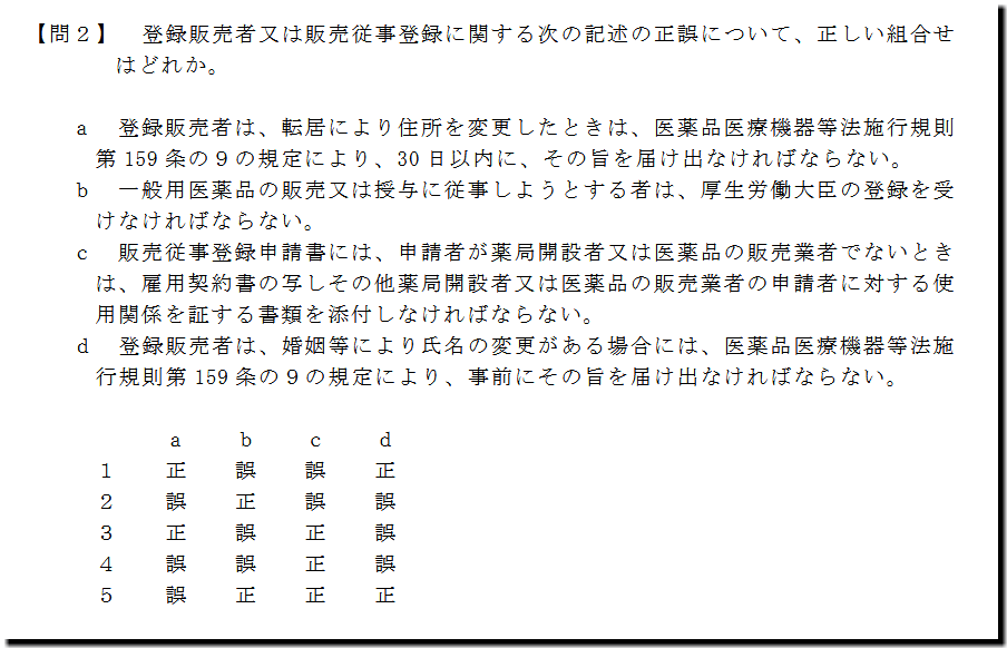 第2問は、「法規」の「登録販売者」の問題です。基礎・基本的なものばかりなので、難しいところはありません。テキストと過去問を繰り返しておけば、まず、取れます。