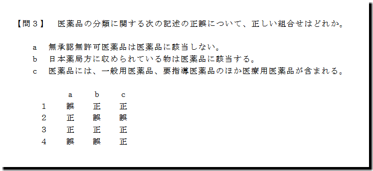 本問は、「法規」の「医薬品の分類」の問題です。難しいところはありません。テキストを精読していれば、おおむね解ける選択肢ばかりです。問題文をよく読んで、常識的に考えれば解ける問題です。