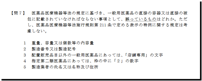 本問は、「法規」の「容器被包記載事項」の問題です。テキストを精読し、過去問演習を繰り返していれば、まず、解ける問題です。貴重な1点を確保です。