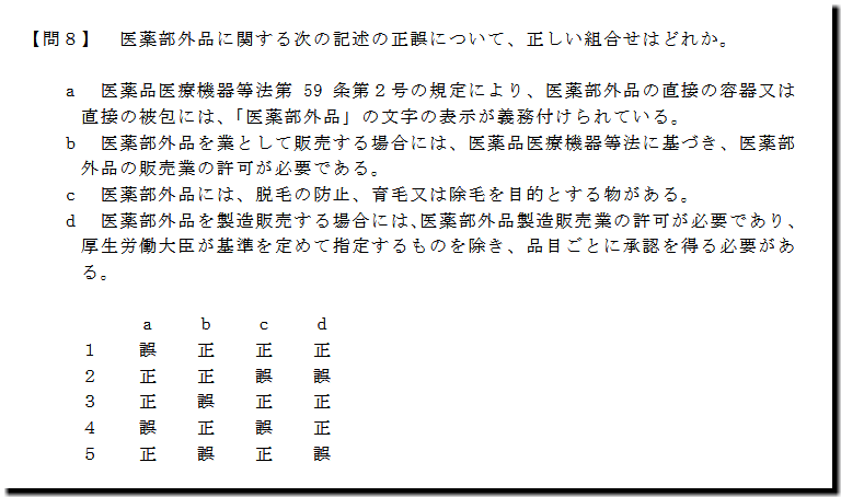 本問は、「法規」の「医薬部外品」への作用の問題です。テキストを精読し、過去問演習を繰り返していれば、まず、解ける問題です。貴重な1点を確保です。