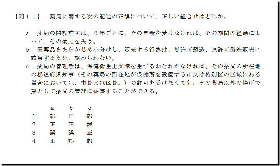 本問は、「法規」の「薬局」の問題です。基礎・基本的なものばかりなので、難しいところはありません。テキストと過去問を繰り返しておけば、まず、取れます。
