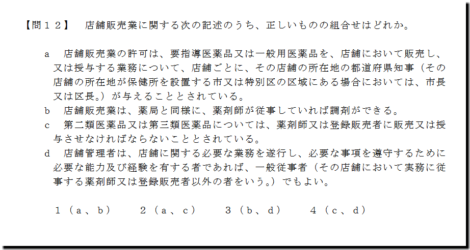 選択肢bの「店舗販売業は、薬局と同様に、薬剤師が従事していれば調剤ができる。」ですが、誤った記述です。