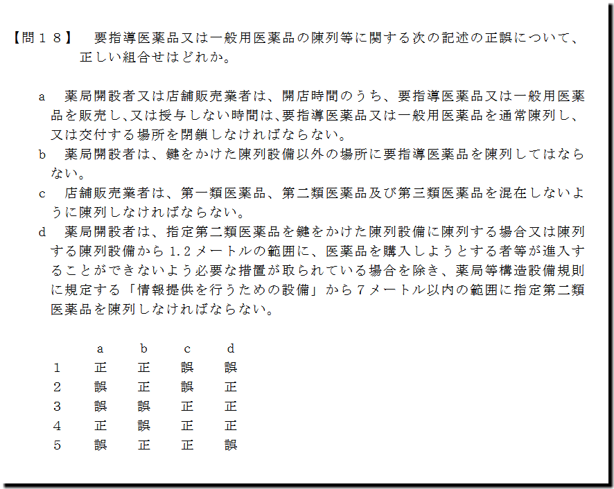 本問は、「法規」の「陳列」についての出題です。ほぼ毎回出題される内容なので、テキストの精読は必須です。選択肢を1つとして、落とさないようにしましょう。