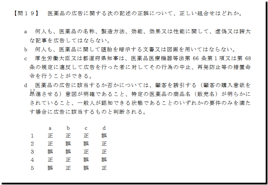 本問は、「法規」の「医薬品の広告」についての出題です。法規では、ほぼ毎回出題される内容なので、テキストの精読は必須です。選択肢を1つとして、落とさないようにしましょう。