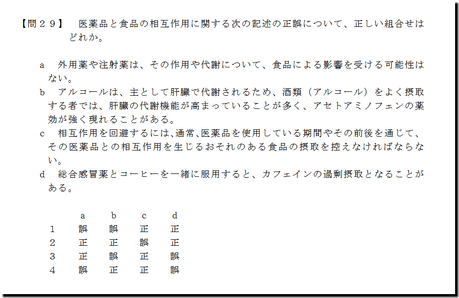 本問は、「基本知識」の「医薬品と食品の相互作用」の問題です。基礎・基本的なものばかりなので、難しいところはありません。テキストと過去問を繰り返しておけば、まず、取れます。