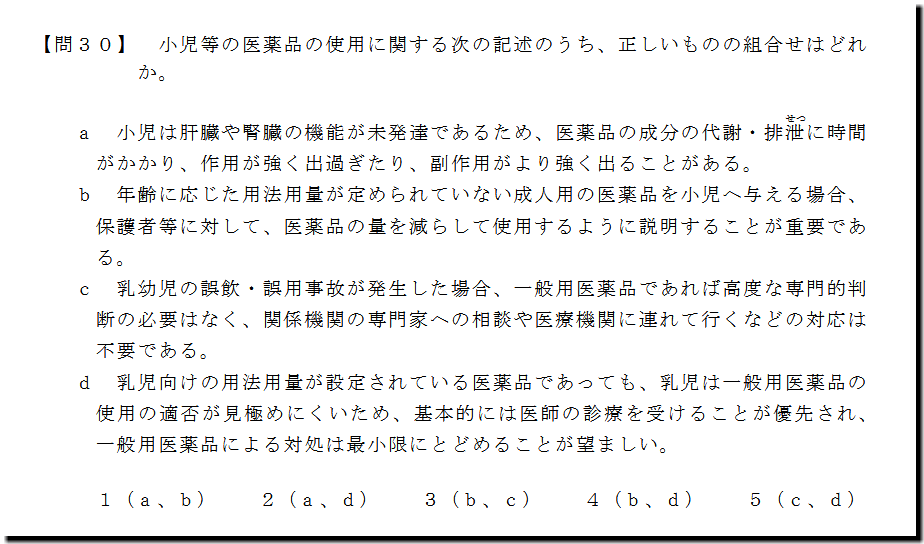 本問は、「基本知識」の「小児等の医薬品の使用」についての問題です。難しいところはありません。テキストを精読し、過去問を解いていれば、穏当に取れます。
