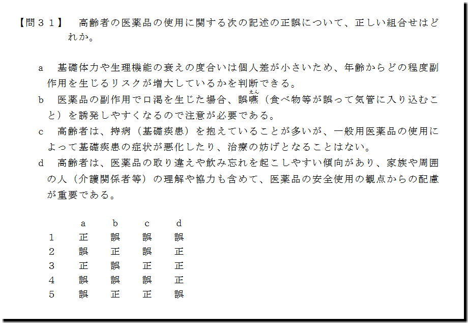 本問は、「高齢者の医薬品の使用」についての問題です。基礎・基本的なものばかりなので、難しいところはありません。テキストと過去問を繰り返しておけば、まず、取れます。