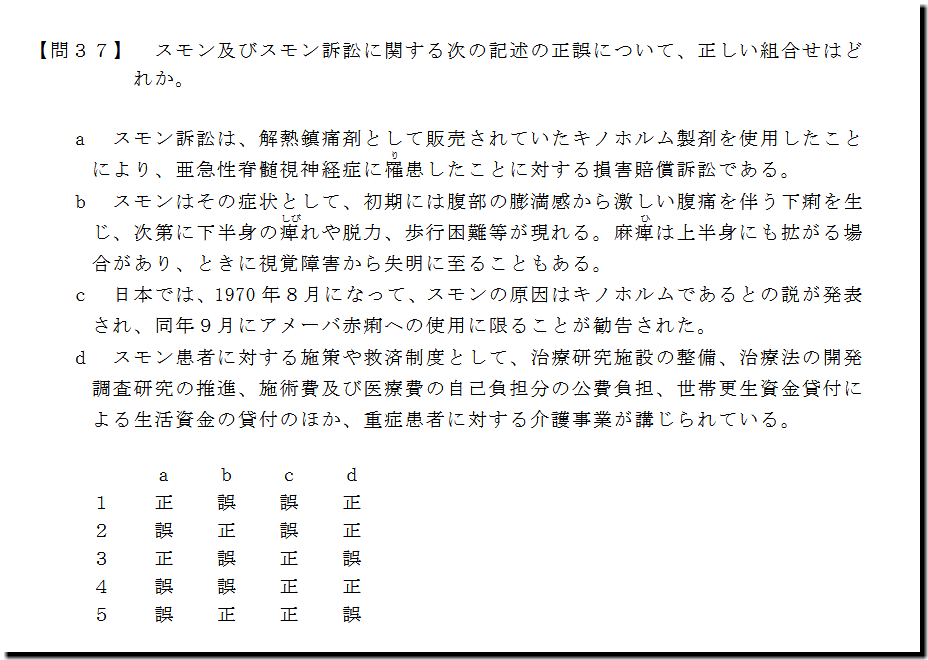 本問は、「基本知識」の「スモン及びスモン訴訟」についての問題です。基礎・基本的なものばかりなので、難しいところはありません。テキストと過去問を繰り返しておけば、まず、取れます。