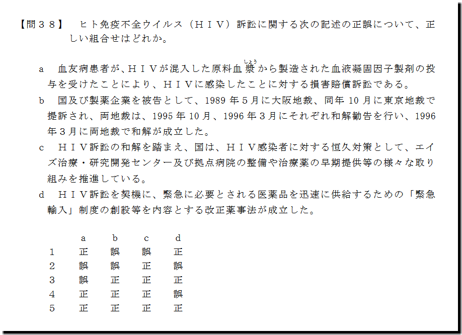 本問は、「基本知識」の「HIV訴訟」についての問題です。基礎・基本事項ばかりです。難しいところはありません。