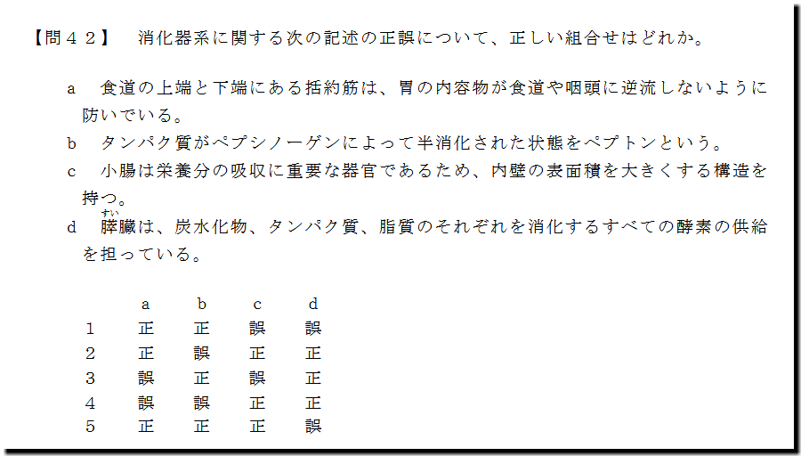 本問は、「人体」の「消化器系」の問題です。基礎・基本的なものばかりなので、難しいところはありません。テキストと過去問を繰り返しておけば、まず、取れます。