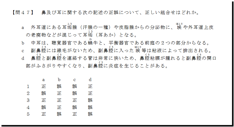 本問は、「人体」の「鼻と耳」についての問題です。基礎・基本的なものばかりなので、難しいところはありません。テキストと過去問を繰り返しておけば、まず、取れます。