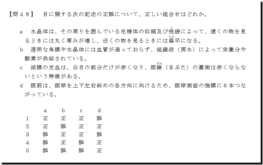 本問は、「人体」の「目」についての問題です。基礎・基本的なものばかりなので、難しいところはありません。テキストと過去問を繰り返しておけば、まず、取れます。
