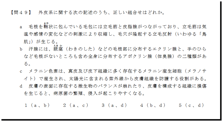 本問は、「人体」の「外皮系」についての問題です。基礎・基本ばかりなので、難しくはありません。