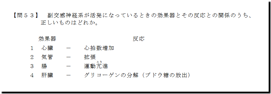 さて、本問では、「副交感神経系が活発になっているとき」ですので、上記図から、答えは、「3 腸 - 運動亢 進」となります。