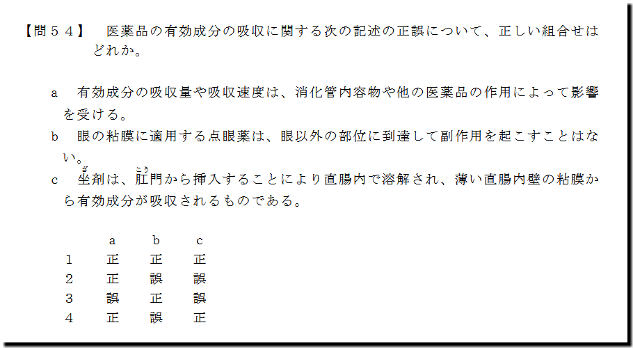 本問は、「人体」の「有効成分の吸収」についての問題です。基礎・基本的なものばかりなので、難しいところはありません。テキストと過去問を繰り返しておけば、まず、取れます。