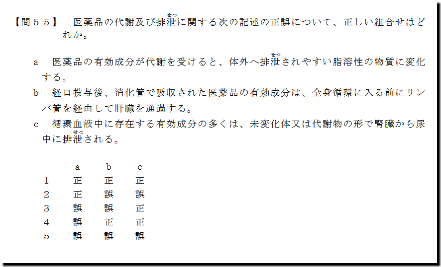 本問は、「人体」の「医薬品の代謝と排泄」についての問題です。基礎・基本的なものばかりなので、難しいところはありません。テキストと過去問を繰り返しておけば、まず、取れます。