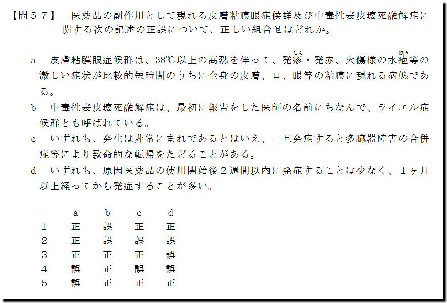 選択肢aの「皮膚粘膜眼症候群は、38℃以上の高熱を伴って、発疹 ・発赤、火傷様の水疱 等の 激しい症状が比較的短時間のうちに全身の皮膚、口、眼等の粘膜に現れる病態であ る。」ですが、正しい記述です。