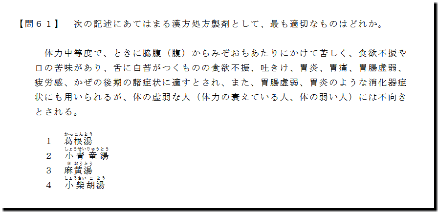 本問は、「医薬品」の「漢方処方製剤(かぜ)」についての問題です。漢方処方製剤の問題です。勉強してないと解けないです。かぜの漢方処方製剤くらいは、押えておきましょう。