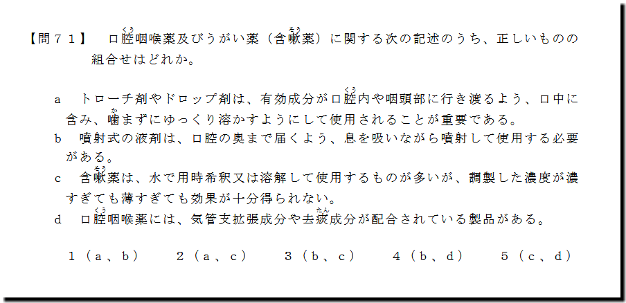 本問は、「医薬品」の「口腔咽喉薬・うがい薬(含嗽薬)」についての問題です。基礎・基本的なものばかりなので、難しいところはありません。テキストと過去問を繰り返しておけば、まず、取れます。