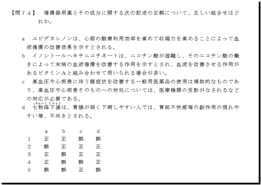 本問は、「医薬品」の「循環器用薬」についての問題です。漢方処方製剤の選択肢が1つありますが、他の選択肢から最終解答を導けます。余裕があれば、漢方処方製剤の選択肢も解けるようにはなっておきましょう。