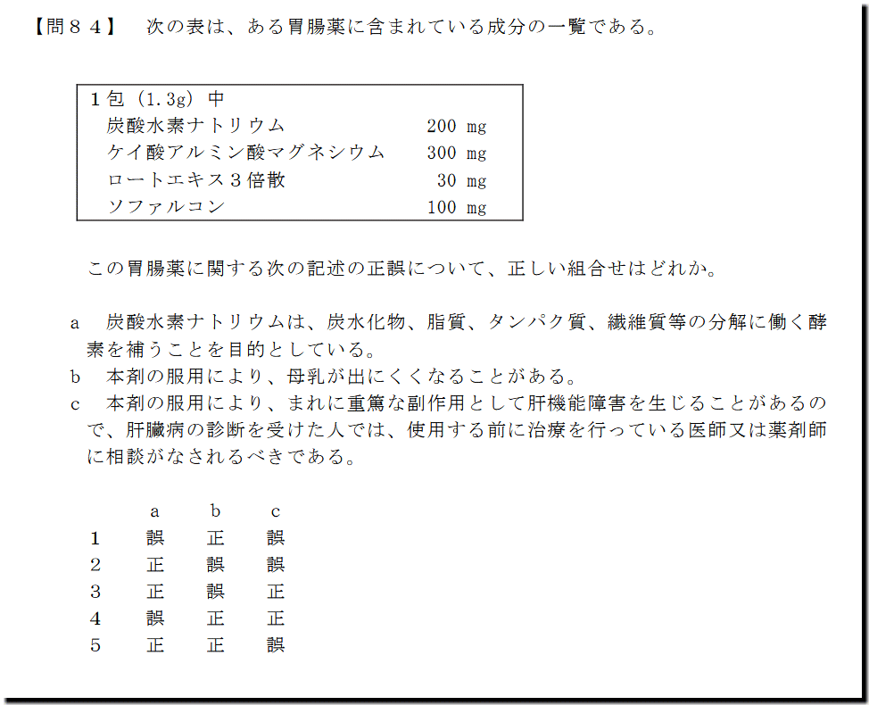 本問は、「医薬品」の「胃腸薬の事例問題」についての問題です。事例問題で良問と言えます。副作用は、ほぼすべて出るといっていいです。傾向把握の一環としても、解いておきましょう。