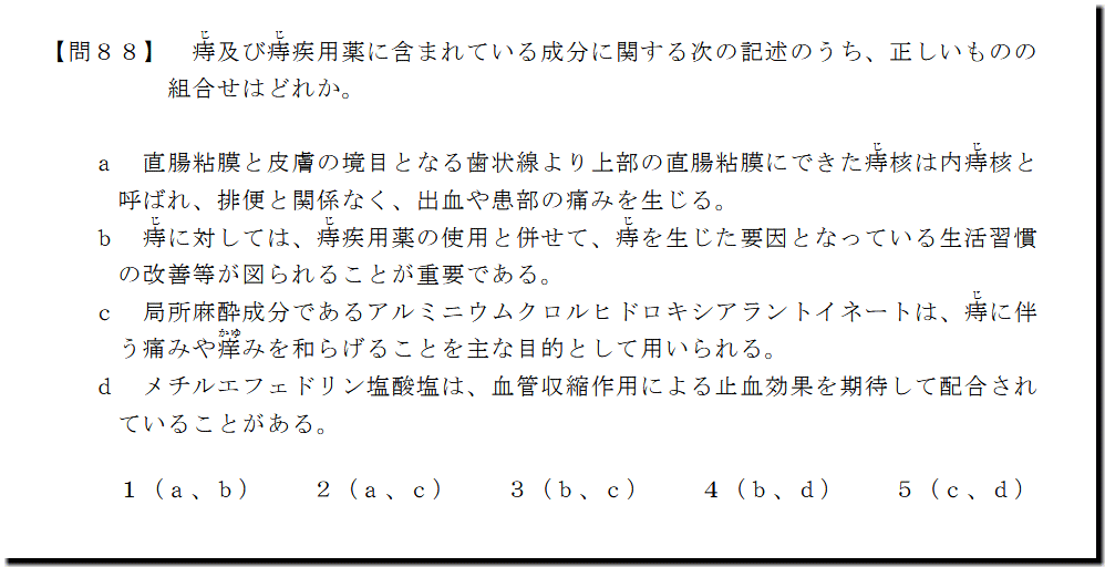 本問は、「医薬品」の「痔疾用薬」についての問題です。難しいところはありません。基礎・基本事項の出題です。
