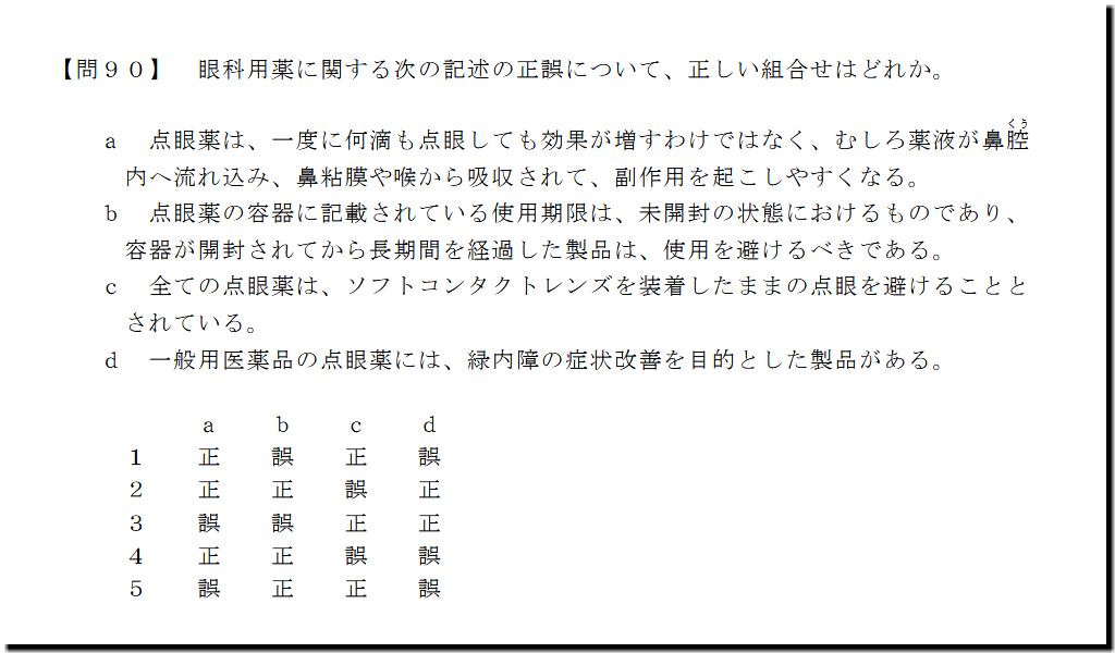 選択肢aの「点眼薬は、一度に何滴も点眼しても効果が増すわけではなく、むしろ薬液が鼻腔 内へ流れ込み、鼻粘膜や喉から吸収されて、副作用を起こしやすくなる。」ですが、正しい記述です。