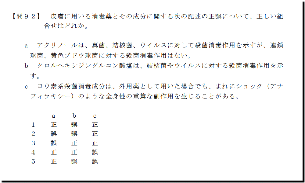 本問は、「医薬品」の「皮膚に用いる消毒薬」についての問題です。難しいところはありません。基礎・基本事項の出題です。