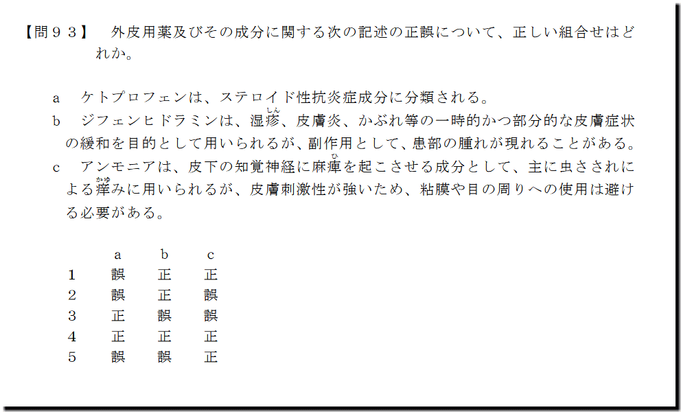 本問は、「医薬品」の「外皮用薬」についての問題です。基礎・基本的なものばかりなので、難しいところはありません。テキストと過去問を繰り返しておけば、まず、取れます。