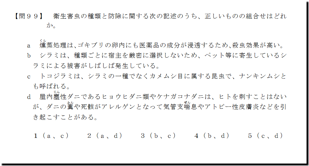 本問は、「医薬品」の「衛生害虫の種類と防除」についての問題です。難しいところはありません。テキストや過去問で、基礎・基本事項を押えて臨んでください。